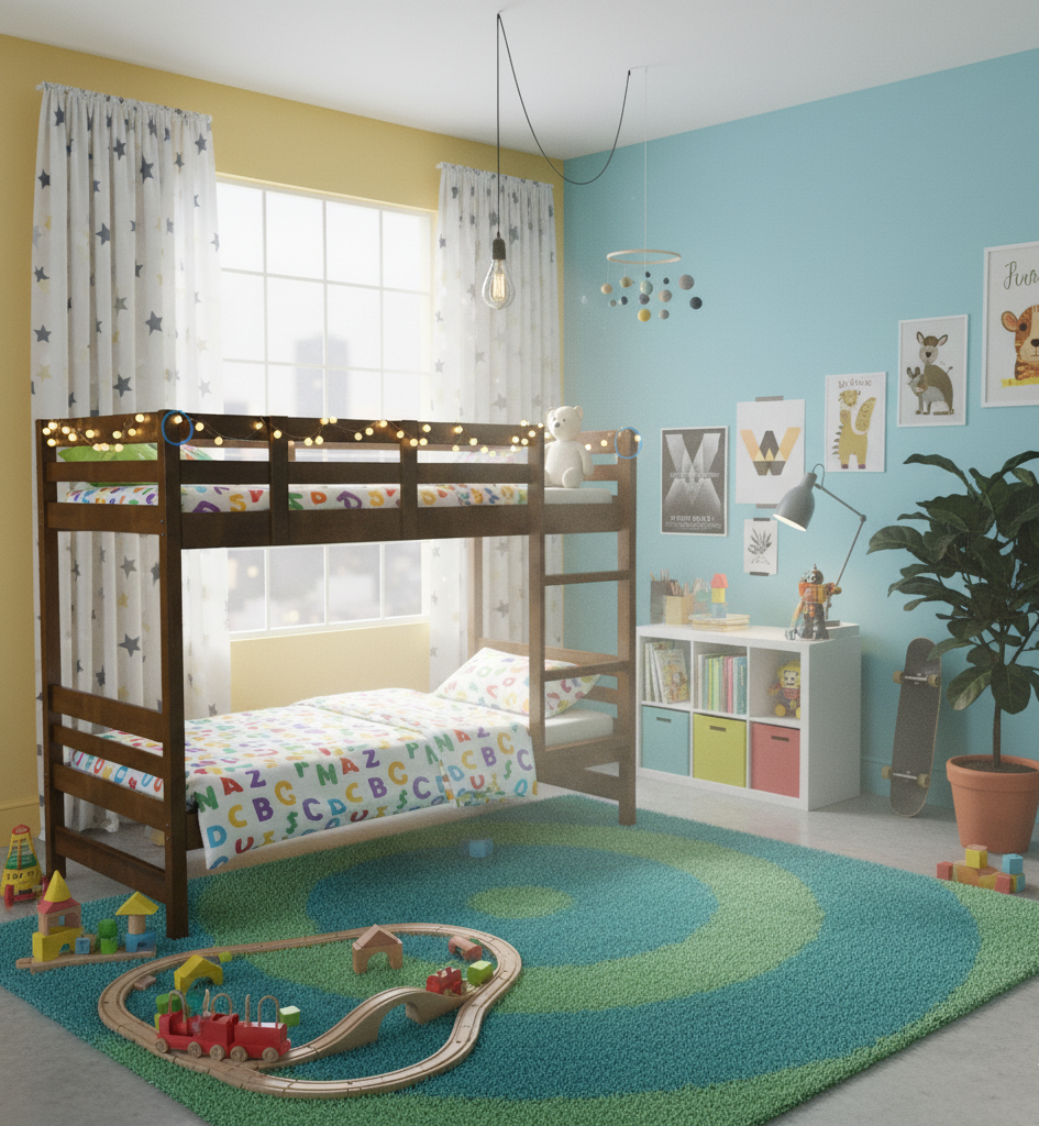 Austin-It is a bunker bed for your kids.This elegant bunker bed is a perfect piece for any kids room.Compact size of this bed leaves plenty of space in the room for a play or additional furnishings.It is a space saving bed.It has been designed keeping safety in mind. Both the layers are protected by the fences.To use the bed on top there is a stair. It is sturdy furniture made with 100% upcycled pine wood.